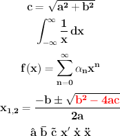 c = \sqrt{ a^2 + b^2 } \int_{-\infty}^{\infty} \frac{1}{x} \, dx f(x) = \sum_{n = 0}^{\infty} \alpha_n x^n x_{1,2}=\frac{-b\pm\sqrt{\color{Red}b^2-4ac}}{2a} \hat a \bar b \vec c x' \dot{x} \ddot{x}